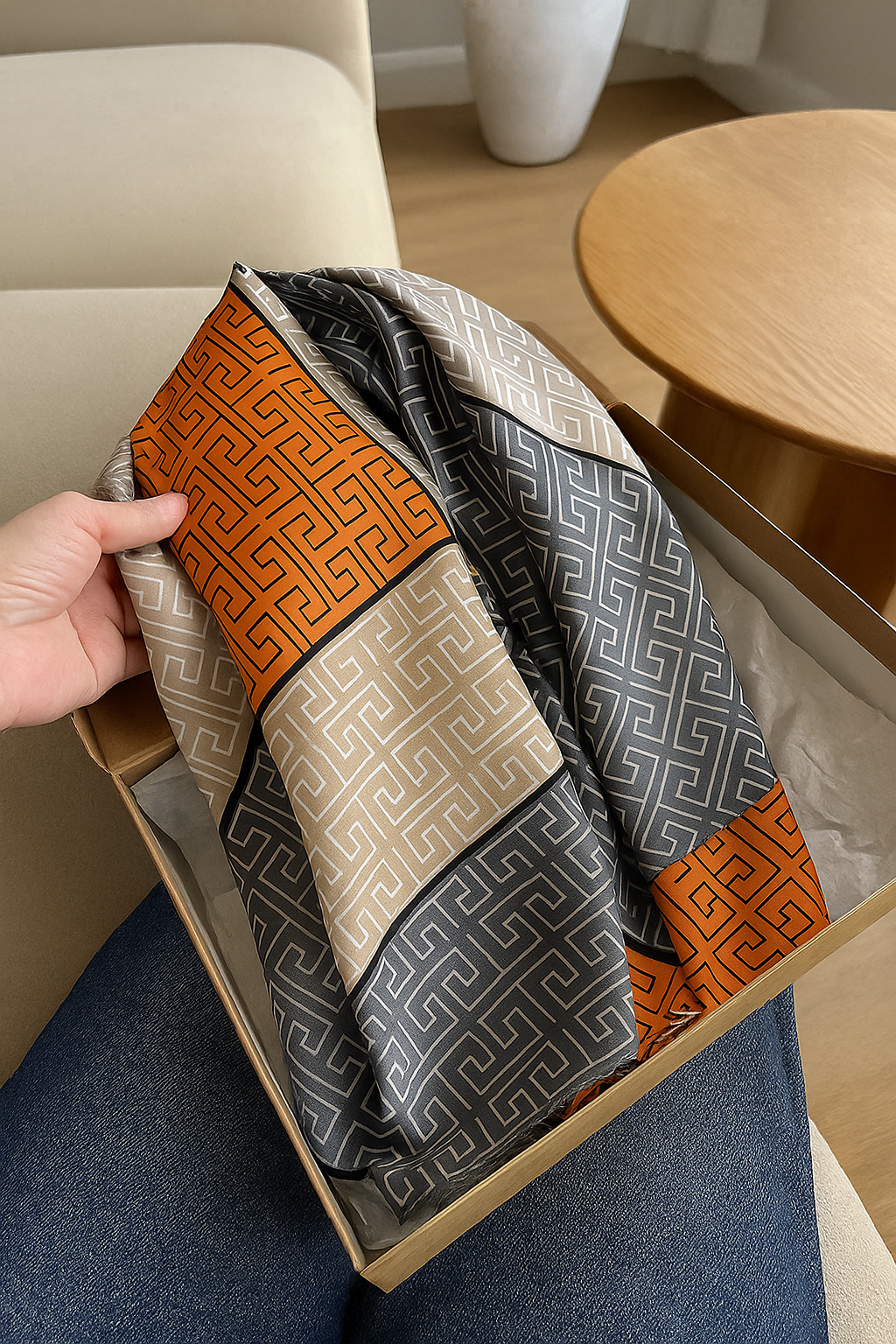 This scarf is absolutely gorgeous the colours are even richer in person, and the fabric is silky-soft with a luxurious feel. I love how versatile it is it instantly elevates any outfit. It came beautifully packaged too, which made it feel like such a treat to unwrap!